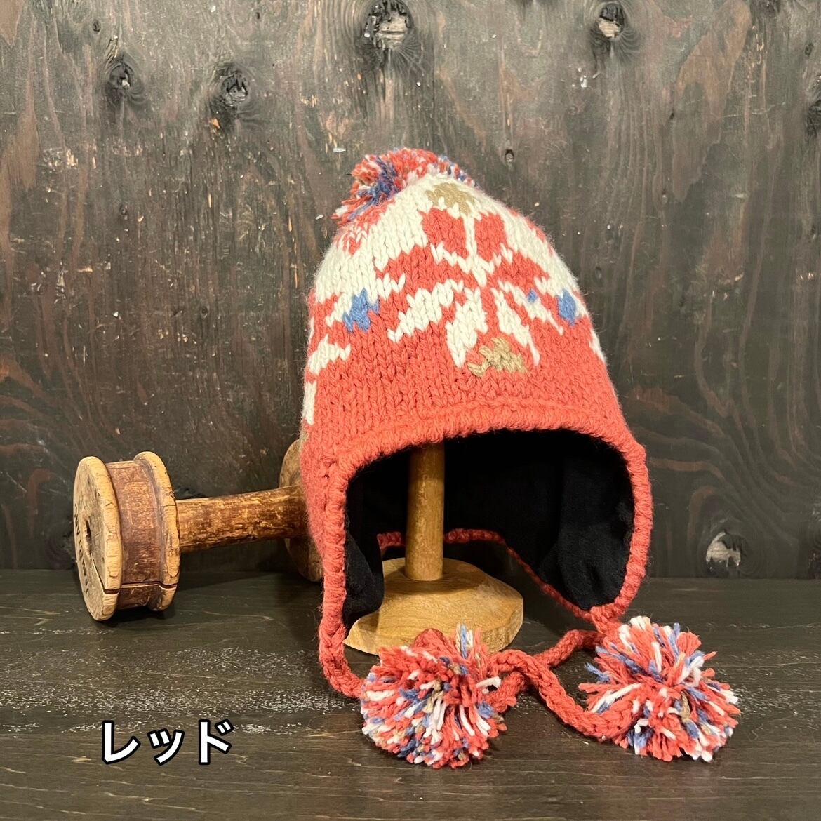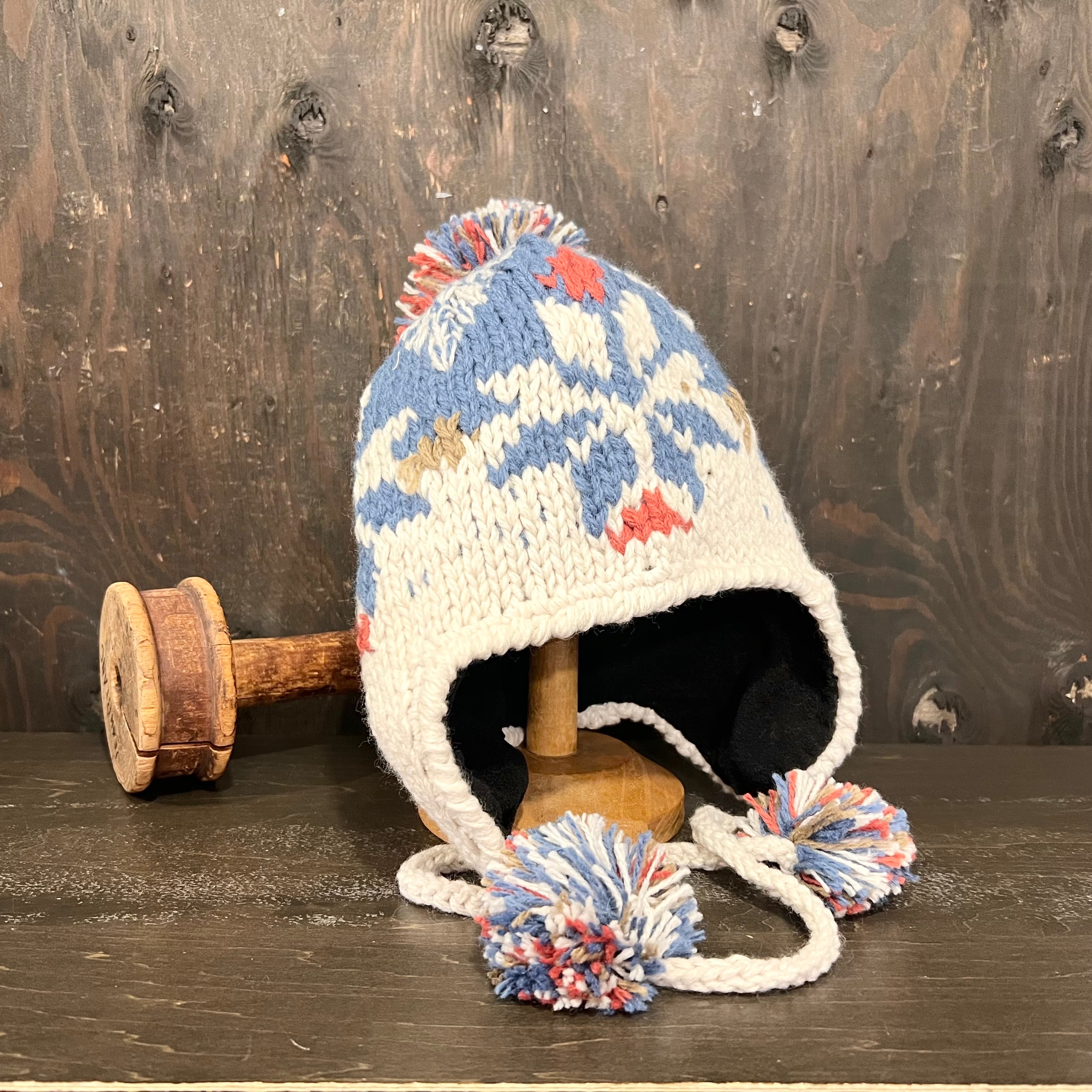 ウールミックス雪柄ニットストリング フライトキャップです。