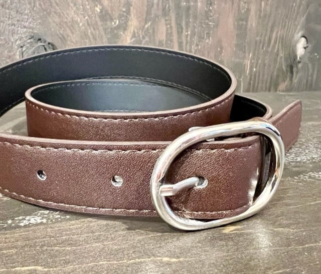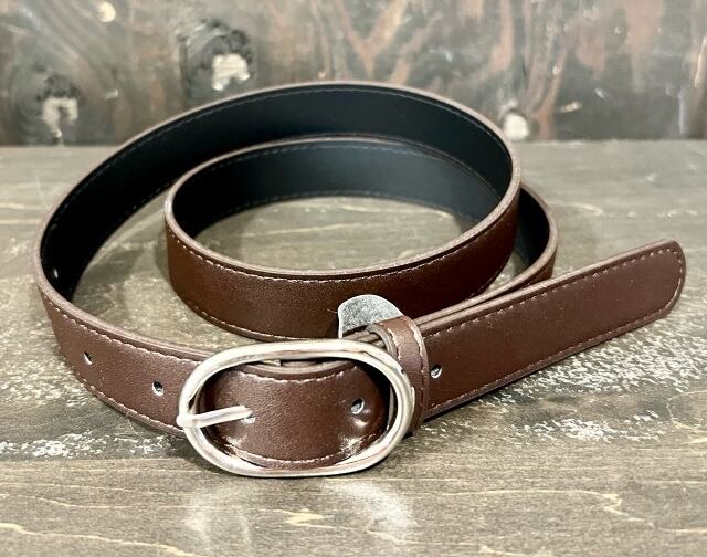レザー2.5cmシルバーカラー楕円型バックルベルトです。