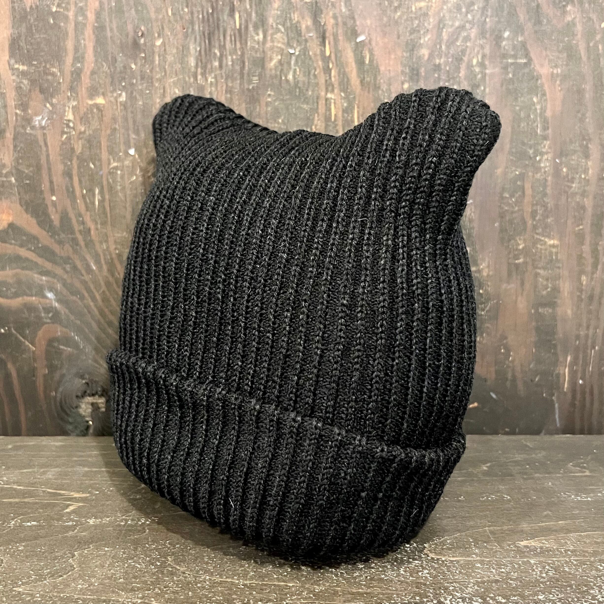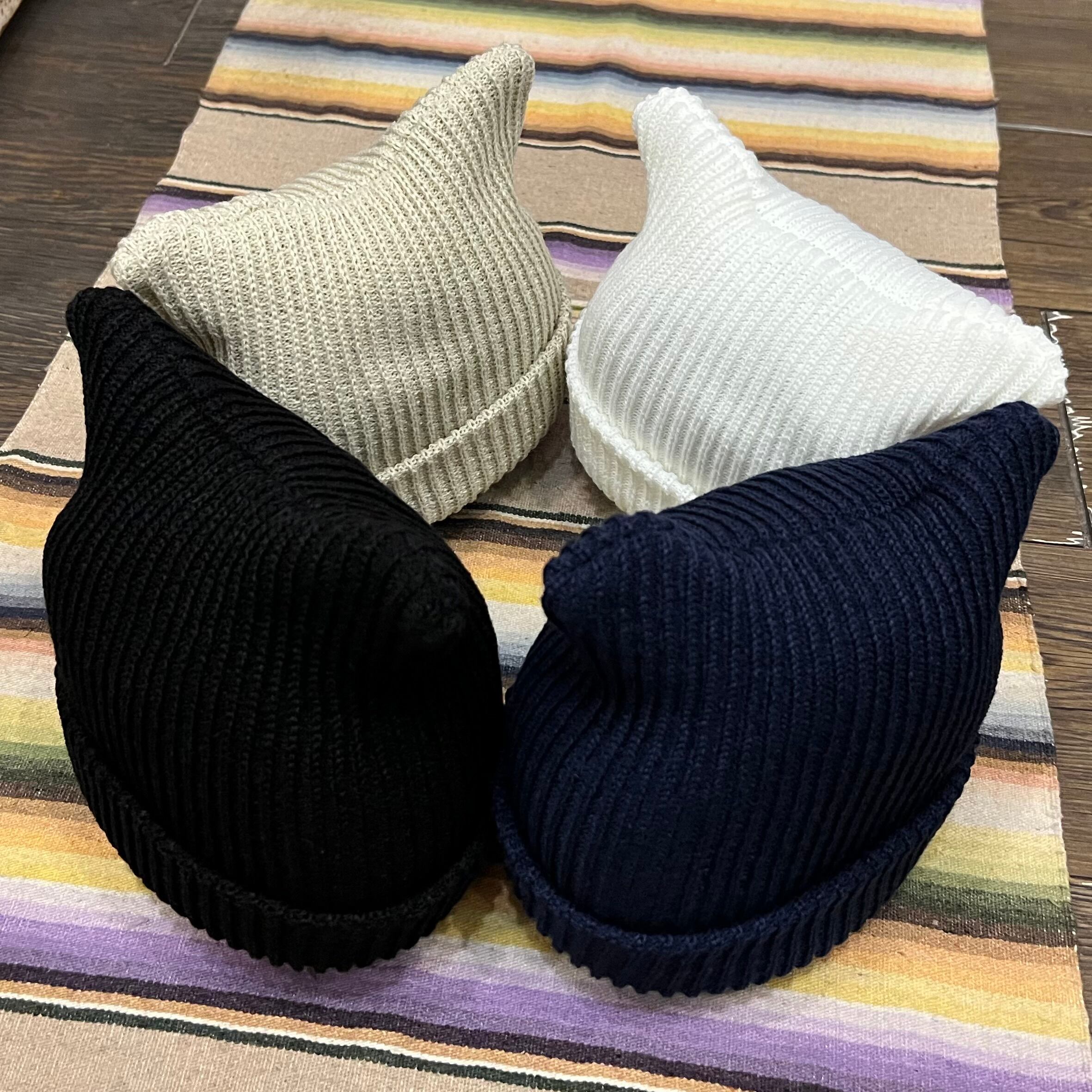 無地のシンプルなニット帽にねこ耳がついたアニマルニット帽になります。