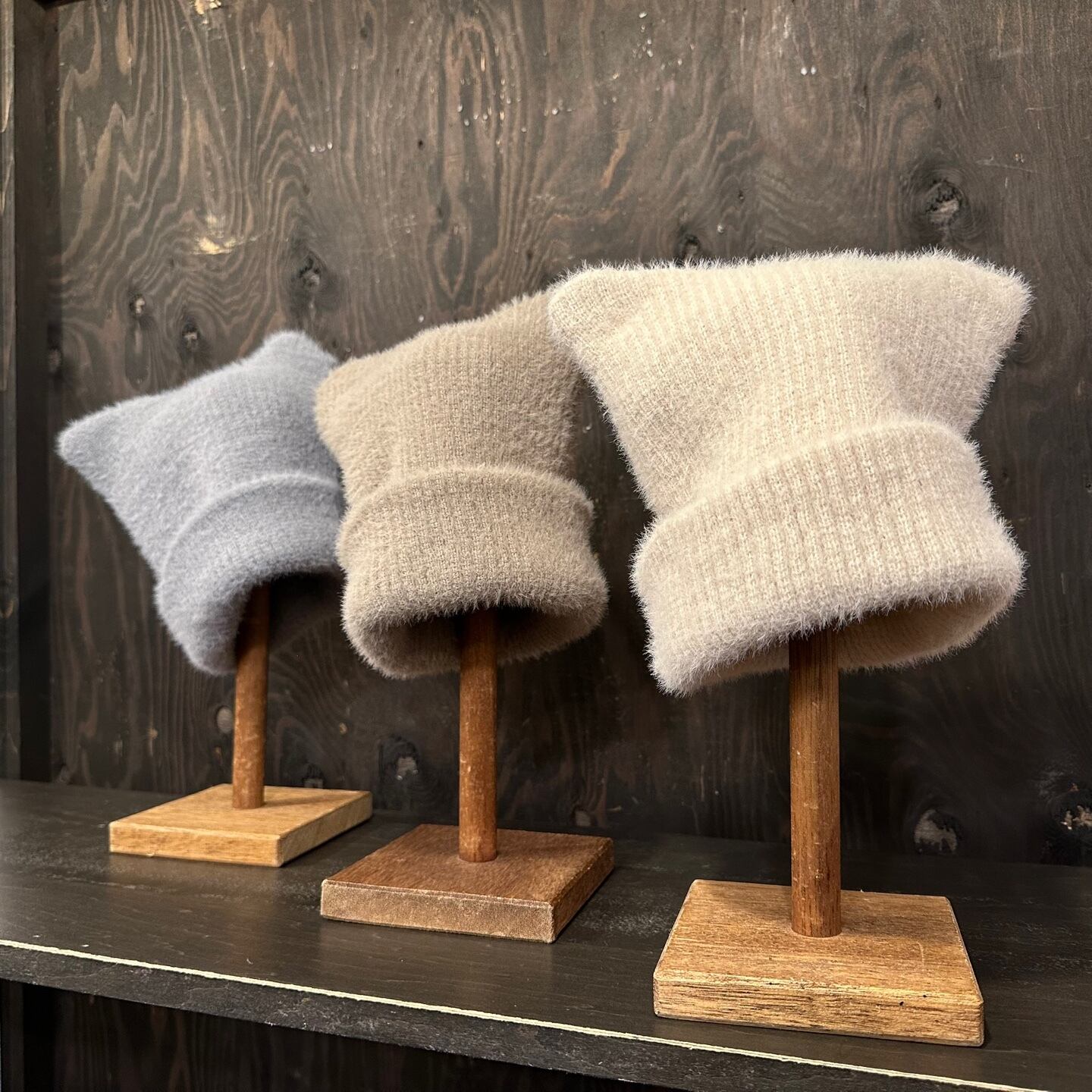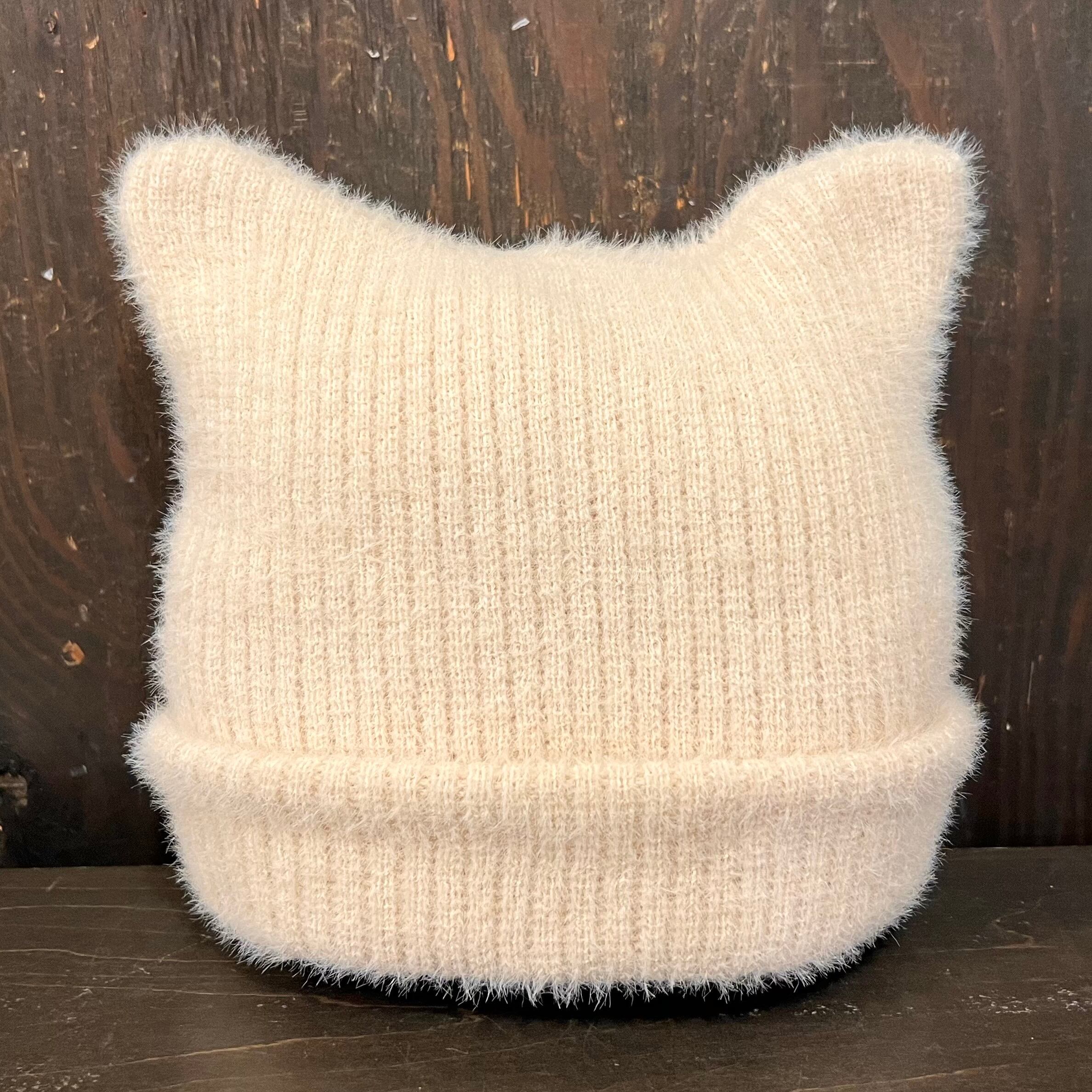 ふわふわとしたモヘア風の素材で作られた、ねこ耳付きのアニマルニット帽になります。